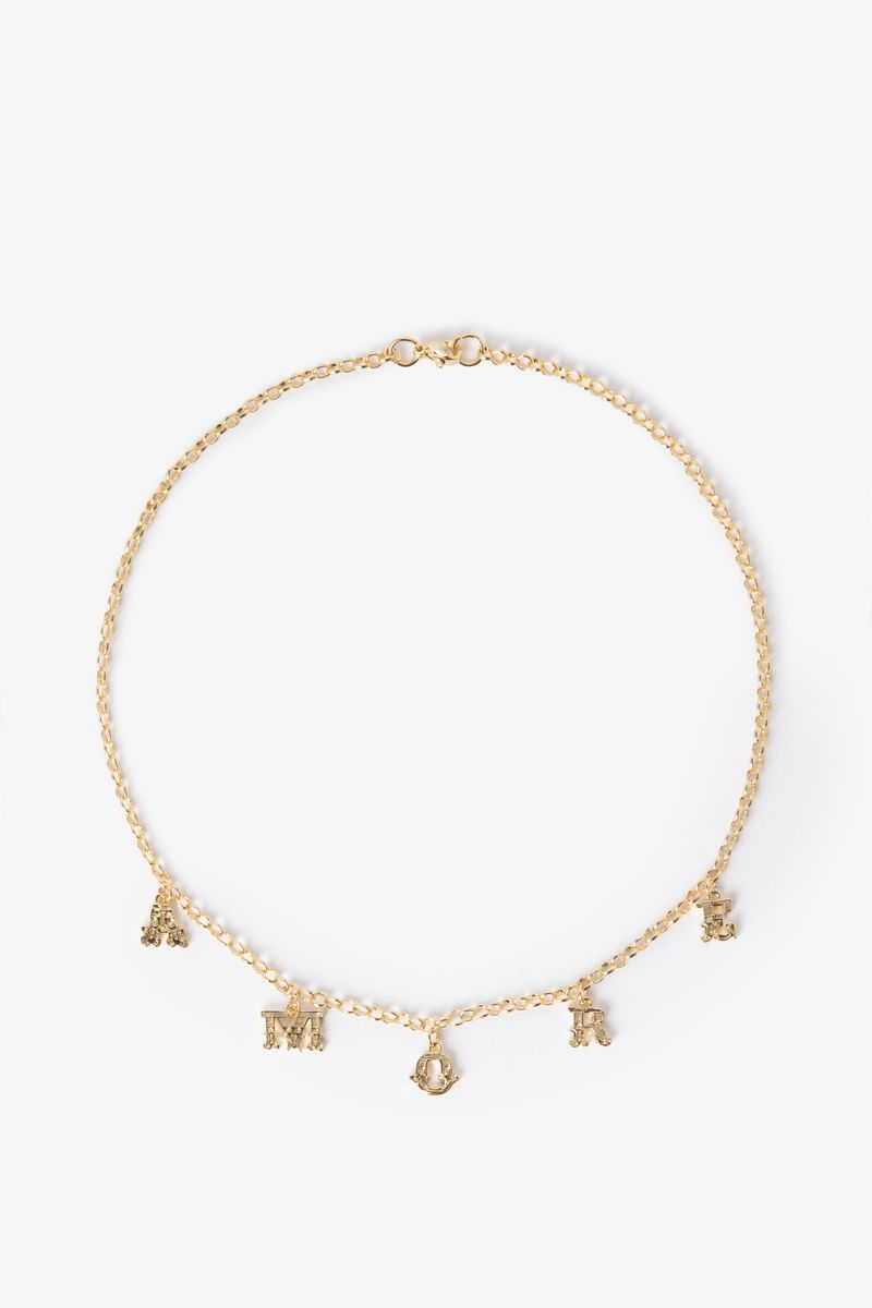 Afmetingen: 210 x 210 x 2 mm. De ketting heeft een gouden kleur met de letters van \'Amore\'die los van elkaar hangen.