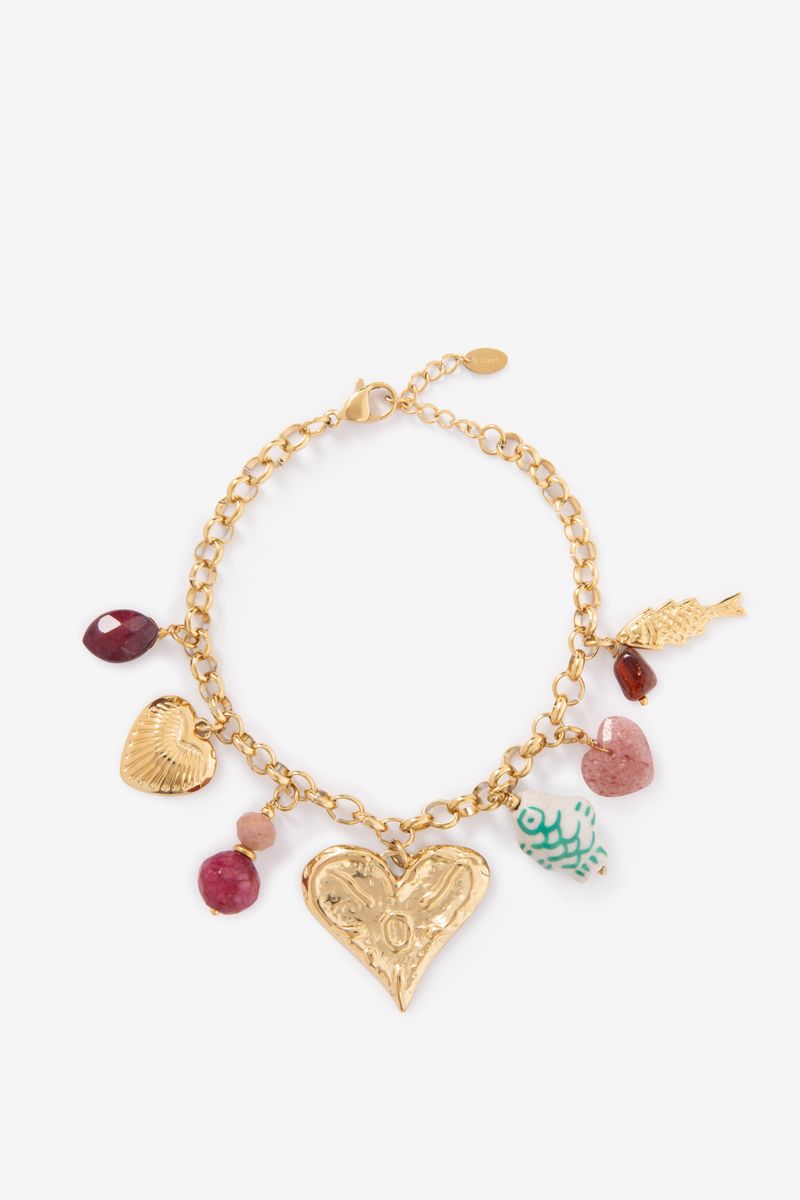 De armband heeft een gouden kleur en is behangen met diverse kleurrijke bedels. Gold plated armband met bedels van Sissy-Boy.
