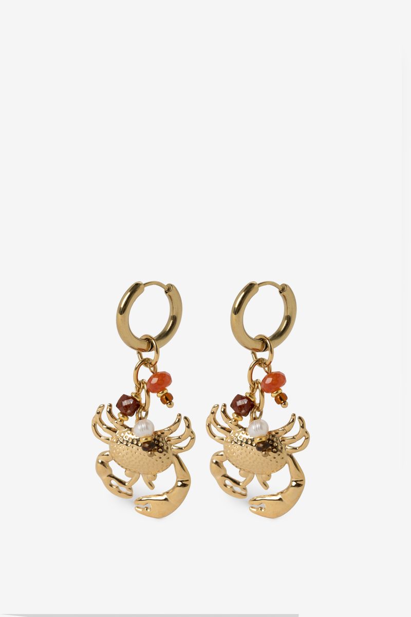Verder hebben de oorbellen rode en witte kralen. De oorbellen hebben een gouden kleur met een kreeften hanger. Gold plated kreeften oorbellen van Sissy-Boy.