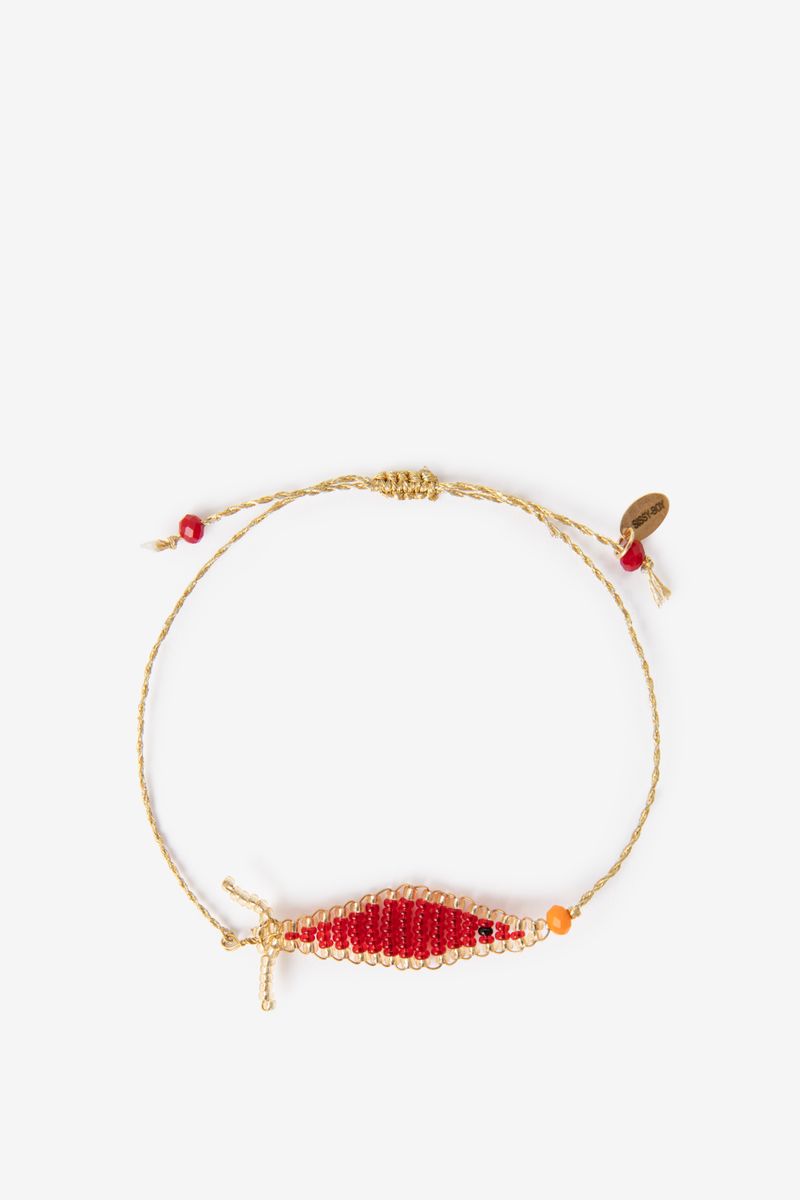 De armband heeft een gouden kleur met kralen in de vorm van een rode vis. Goudkleurige vissen armband van Sissy-Boy.