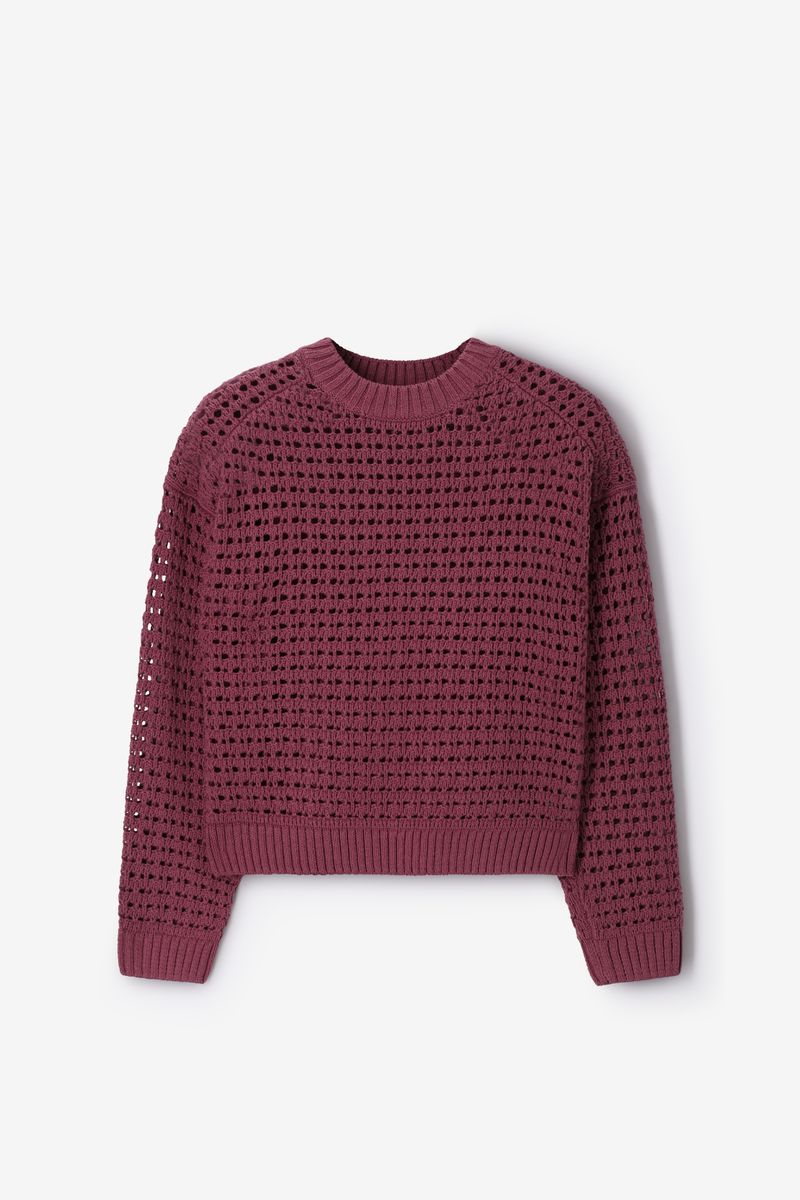 Verder heeft de trui een donkerroze kleur met gebreide opengewerkte details in de stof. De trui heeft lange mouwen, een ronde halslijn en een relaxed fit.