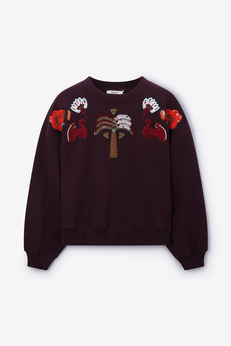 Het model heeft een lengte van 1,71 m en draagt maat S. Verder heeft de sweater aan de voorzijde een kleurrijk detail met pailletten.