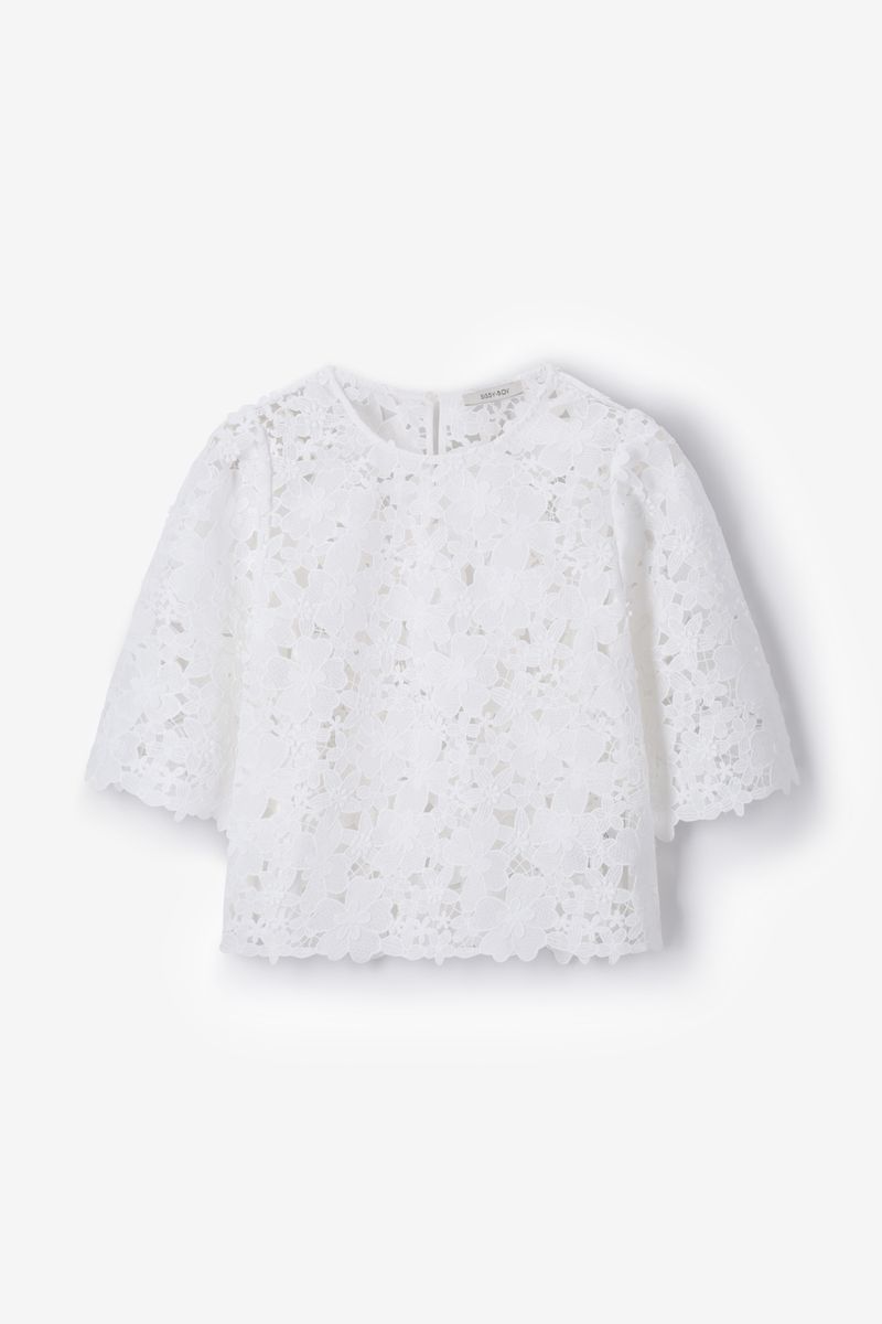 Verder heeft de top een witte kleur met een opengewerkte bloemenpatroon. De top heeft driekwart mouwen, een ronde halslijn en een regular fit.