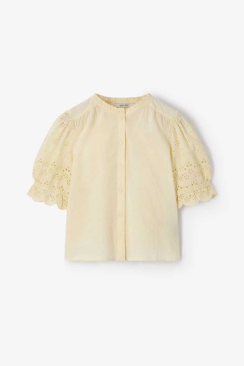 Verder heeft de blouse een lichtgele kleur met een broderie anglaise design op de mouwen. De blouse heeft korte pofmouwen, een ronde halslijn, een knoopsluiting aan de voorzijde en een regular fit.