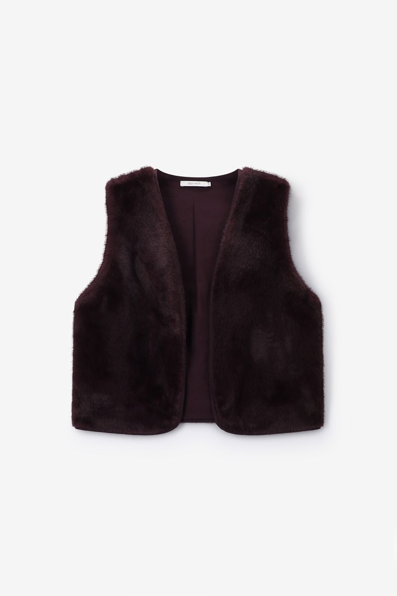Daarnaast heeft het een donkerrode kleur met een faux fur kwaliteit aan de buitenzijde. Het gilet is gevoerd, mouwloos en heeft geen sluiting.