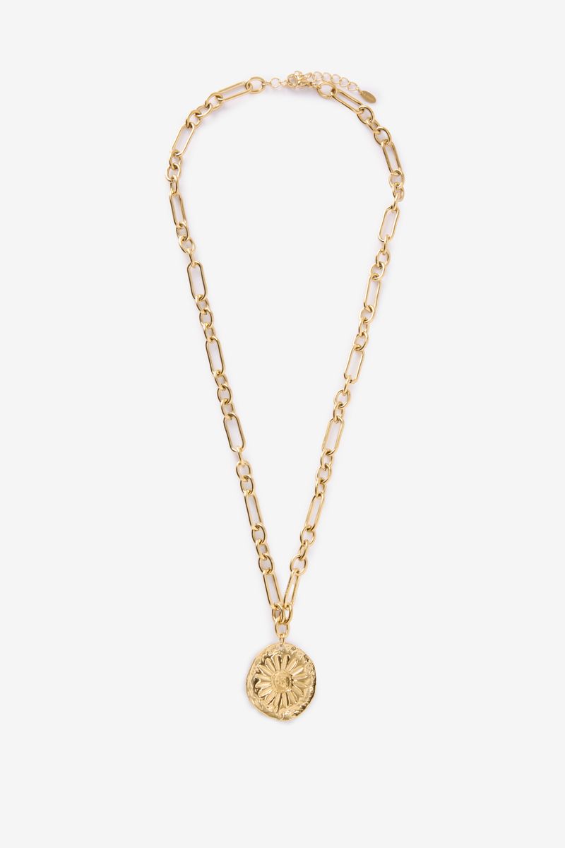 De goudkleurige schakelketting is verstelbaar en heeft een gouden muntje met een bloem als bedel. Gold plated schakelketting met muntje van Sissy-Boy.