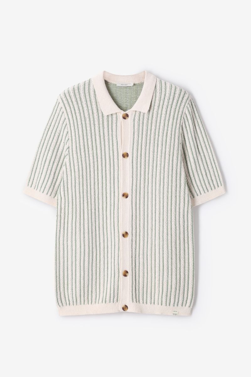 Verder heeft het vest een groene kleur met een all-over verticale strepen design in het beige. Het vest heeft korte mouwen, een hoge hals, een kraag en een knoopsluiting.