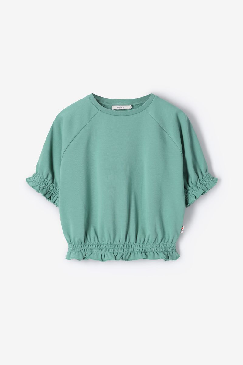 Verder heeft het T-shirt een groene kleur, jersey kwaliteit en ruffle details. Het T-shirt heeft korte pofmouwen, een ronde halslijn met elastiek bij de mouwen en onderzijde.